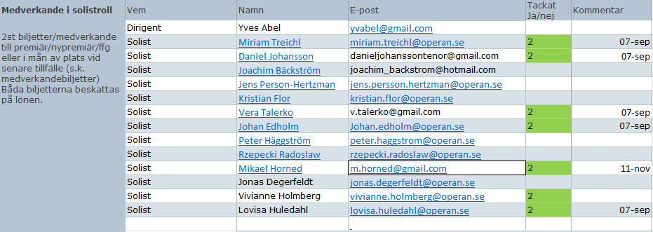 I bokningen av medverkandebiljetter utgår vi alltid ifrån de solister som står med i medverkandelistan som vi får in till respektive produktion. Dessa listor finns som Excel-dokument i mappen Biljettkontoret (Y:) → Medverkandebiljetter. Fyll i dokumentet om en solist bokar sina biljetter, så vet vi att de plockats ut.